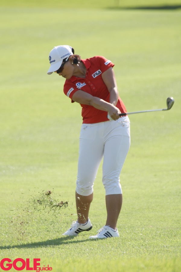 `2012 한화 금융 클래식` 대회 1라운드 18번홀에서 박세리가 땅을 차며 세컨샷을 하고 있다.