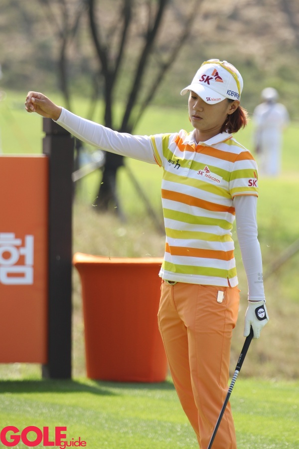 `2012 한화 금융 클래식` 대회 2라운드 8번홀에서 최나연이 티샷전 바람을 확인 하고 있다.