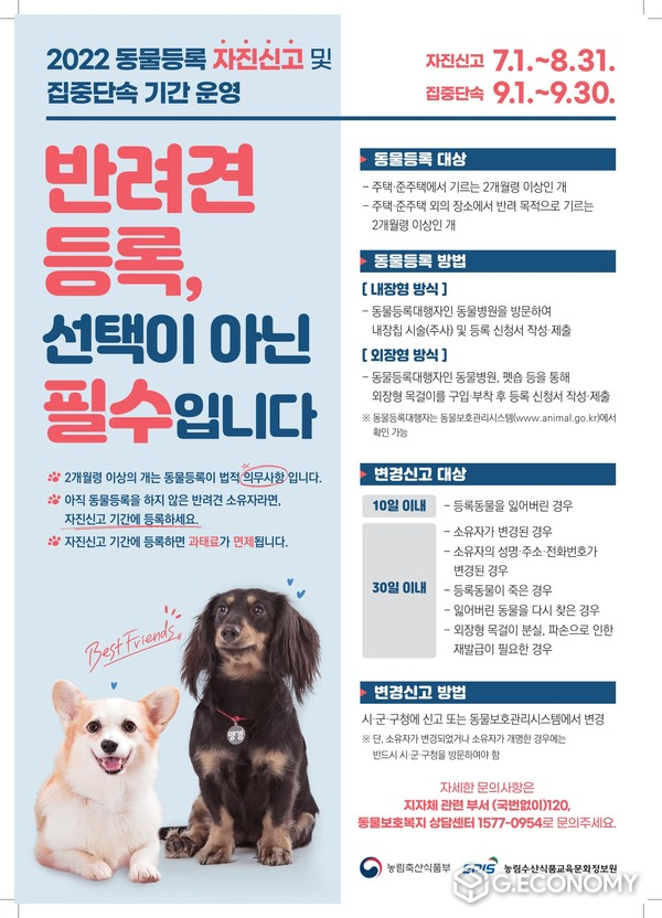 김종래 동물자원과장은 "동물등록은 이제 필수로, 전국적으로 자진신고 기간을 운영하는 만큼 반려인들의 많은 관심과 참여를 바란다"고 당부했다.