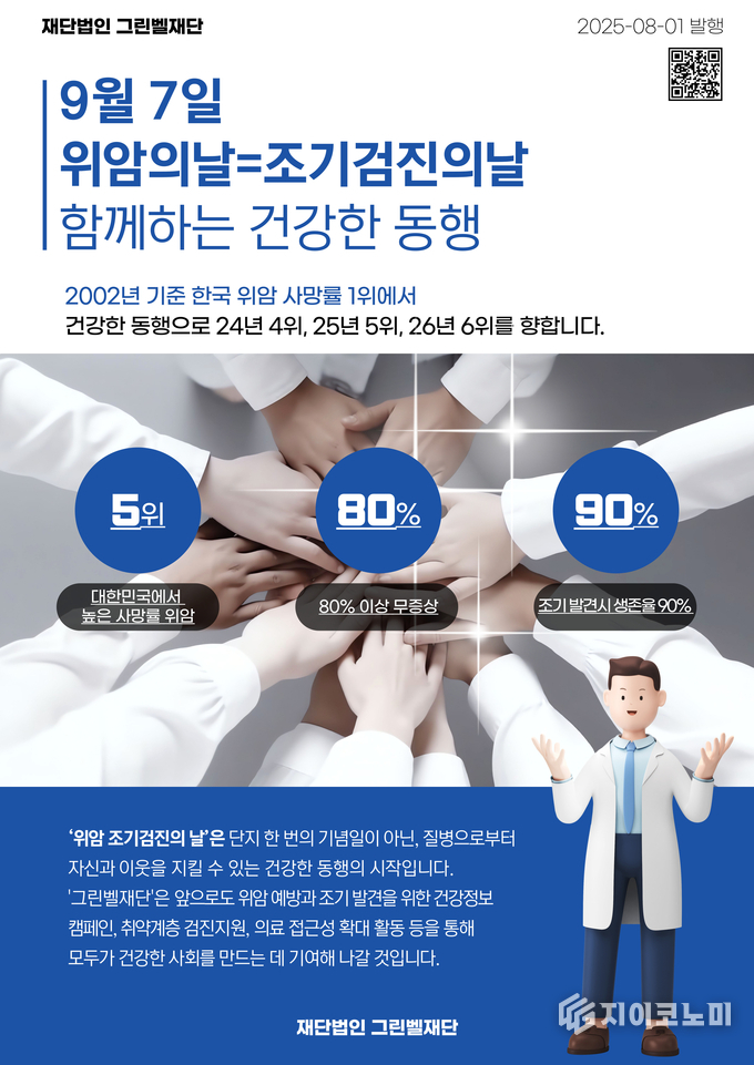 지이코노미 최영규 기자 | 재단법인 그린벨재단은 오는 9월 7일 ‘위암 조기검진의 날’을 맞아, 위암에 대한 국민 인식을 높이고 조기검진의 중요성을 널리 알리기 위한 대국민 위암 예방 캠페인을 공식 후원한다고 밝혔다.