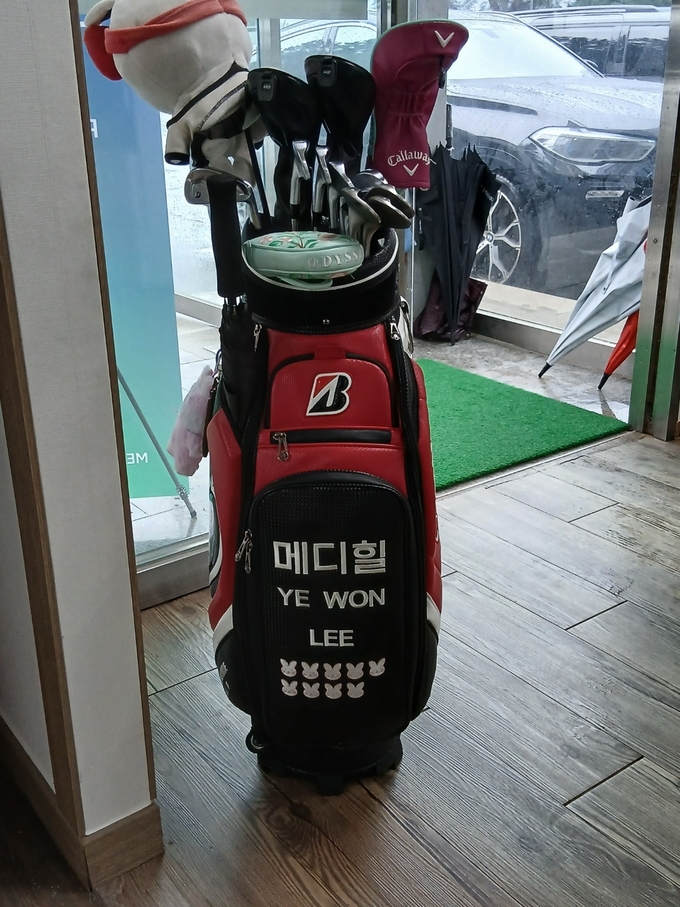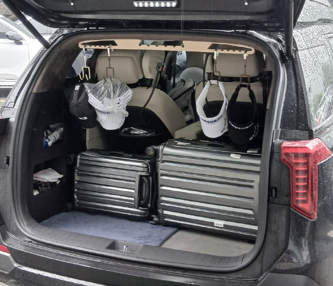 이예원 선수가 타고 온 자동차 트렁크에 가지런히 정돈된 가방과 각종 골프 용품