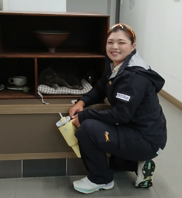 장하나 선수가 연습장에서 기르는 고양이를 돌보며 포즈를 취했다. 표정이 참 밝고 천진하다