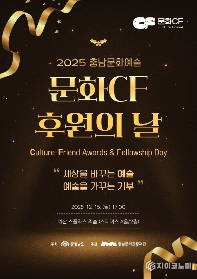 지이코노미 정길종 기자 |충남문화관광재단(대표이사 이기진)은 오는 12월 15일 리솜스플라스 세미나실에서 ‘문화CF 후원의 날 – 세상을 바꾸는 예술, 예술을 가꾸는 기부’ 행사를 개최한다.