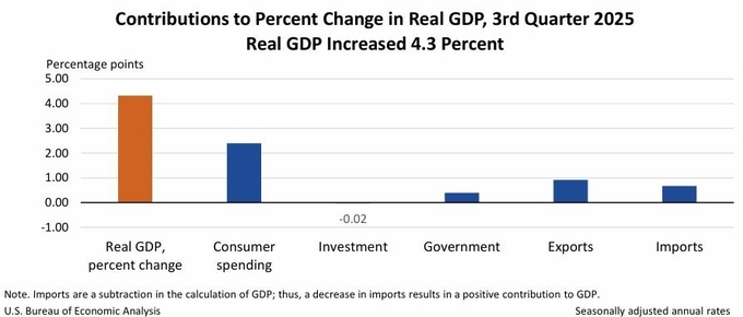 미국 상무부는 3분기 국내총생산(GDP) 증가율이 4.3%(전기 대비 연율)로 집계됐다고 23일(현지시간) 밝혔다.