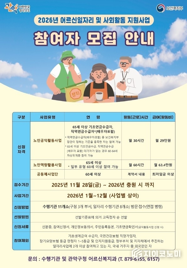 지이코노미 최영규 기자 | 관악구(구청장 박준희)가 초고령시대 진입을 앞두고 어르신들의 사회참여 증진과 노후 소득 보장을 위해 ‘2026년 노인일자리 및 사회활동 지원사업’을 대폭 확대 추진한다.