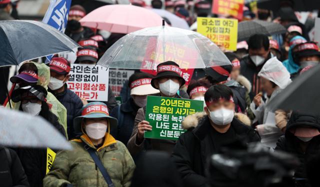 지이코노미 강매화 기자 | 홍콩 H지수 ELS피해자들이 2024년 3월 29일 서울 여의도의 한 은행 앞에서 집회를 열고 금융상품 손실 보상을 촉구하고 있다.