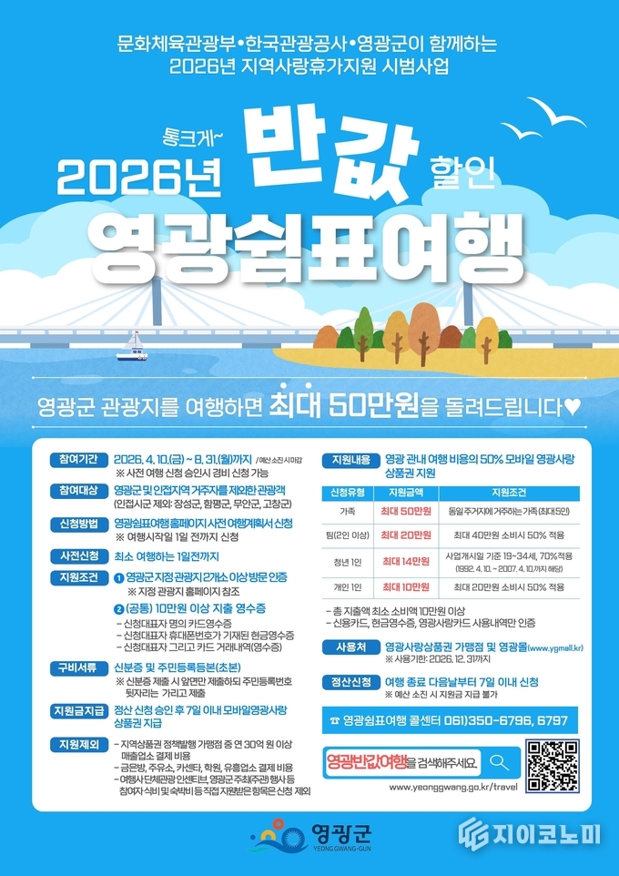 군 관계자는 “관광객에게는 합리적인 여행 기회를 제공하고, 지역 상권에는 실질적인 도움이 되는 구조”라며 “영광의 자연과 먹거리, 체험을 함께 즐길 수 있는 계기가 되길 바란다”고 말했다.