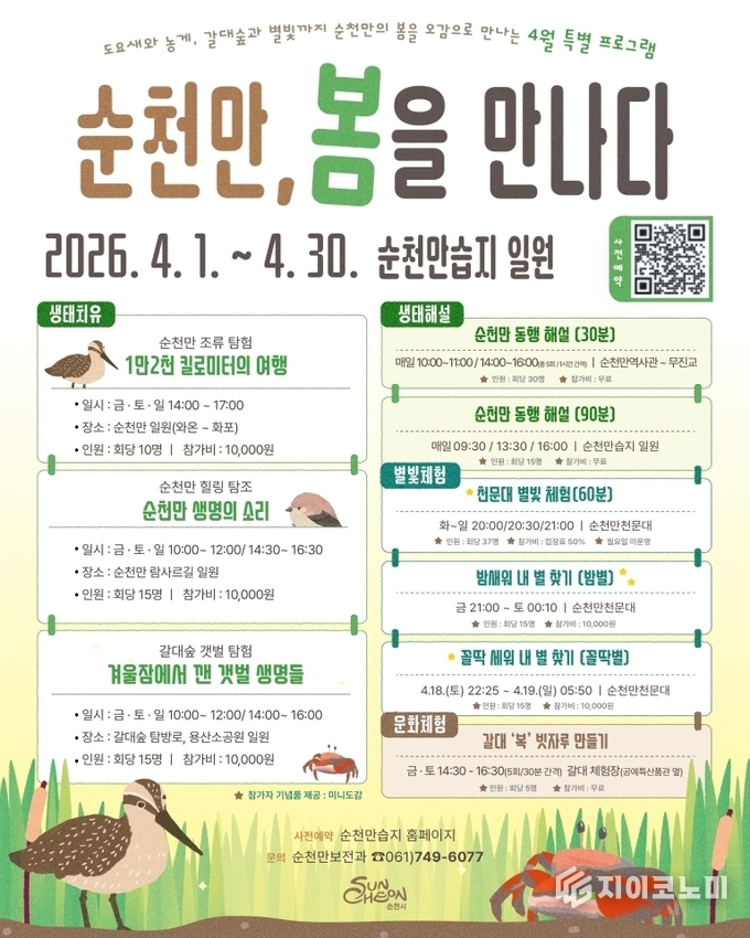 지이코노미 오명숙 기자 | 전남 순천시가 4월을 맞아 도요새와 농게를 주제로 한 생태체험 프로그램 ‘순천만, 봄을 만나다’를 운영한다.