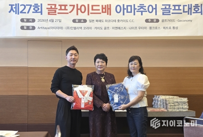 이번 대회는 경쟁의 긴장감과 여행의 즐거움, 그리고 참가자 간 교류가 어우러진 프리미엄 아마추어 골프 축제로 마무리되며 다시 한번 골프가이드배의 위상을 입증했다.제27회 골프가이드배 남여아마추어 골프대회 메달리스트 시상식에서 남자부 강희정(69타), 여자부 곽순이(81타) 수상자가 카이도골프 배우균 대표로부터 최고급 아이언 세트를 전달받고 기념촬영을 하고 있다.