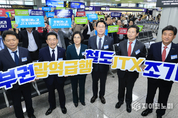 지이코노미 최영규 기자 | 화성특례시(시장 정명근)를 비롯한 성남시, 광주시, 용인특례시, 안성시, 진천군, 청주시 등 7개 시군이 ‘중부권 광역급행철도(잠실~청주)’의 조기 추진을 촉구하기 위한 결의에 나섰다. 이들 지자체는 14일 청주국제공항에서 정명근 화성특례시장을 비롯한 방세환 광주시장, 이상일 용인특례시장, 김보라 안성시장, 송기섭 진천군수, 임종철 성남시 부시장, 신병대 청주시 부시장 등이 참석한 가운데 결의대회를 개최했다. 참석자들은 중부권 광역급행철도 조기 추진을 위한 공동건의문 발표 및 서명에 이어, 핸드프린팅과 슬로건 퍼포먼스를 펼치며 사업 조기 착공을 향한 강한 의지를 다졌다. 중부권 광역급행철도는 서울과 이들 지자체를 연결하는 연장 약 134km의 민간제안사업으로, 공동건의문에는 ▲민자적격성조사 신속 통과 ▲관련 행정절차 신속 이행 ▲사업 조기 착공을 위한 관계기관의 적극적인 관심과 협조를 건의하는 내용이 담겼다. 건의문은 관계기관에 전달될 예정이다. 앞서 화성특례시는 청주국제공항 접근성 강화와 인접 지자체 이동 편의 개선을 위해 ‘동탄~청주공항 광역철도 사업’을 추진해 왔으며, 해당 사업은 2021년 국토교통부 「제4차 국가철도망 구축
