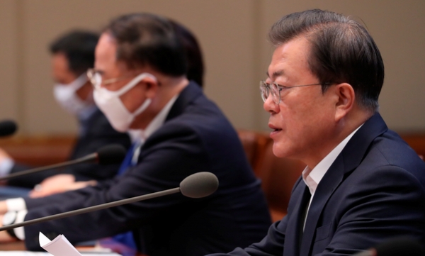 문 대통령은 "코로나19가 세계 경제에 남기는 상처가 얼마나 크고 깊을지, 그 상처가 얼마나 오래갈지 아무도 예측할 수 없는 상황"이라며 "당장도 어렵지만 미래도 불확실하다. 당장의 어려움을 타개해 가면서 어두운 터널을 지나 경기를 반등시키는 긴 호흡을 가져야 한다"고 강조했다.