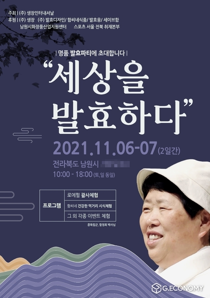 금번 행사는 주최 ㈜생장인터내셔날과 후원 남원시화장품산업지원센터, ㈜발효디자인, 함씨네식품, 등이 함께하는 행사로 남원시 체험공장에서 '세상을 발효하다'라는 주제로 진행된다.