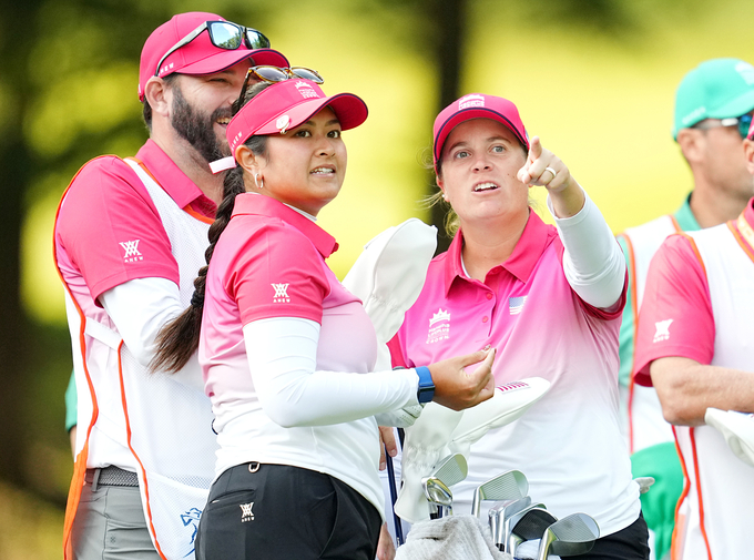 미국팀의 로런 코플린(우측)과 릴리 부가 4번 홀 타구를 가르키고 있다