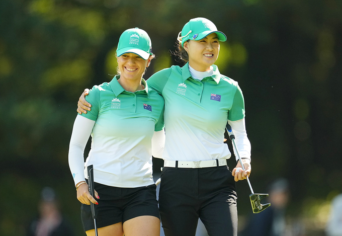 호주팀의 이민지(오른쪽)와 스테파니 키리아코가 3번 홀 승리 후 기뻐하고 있다
