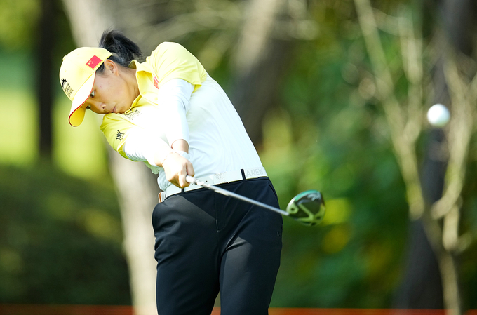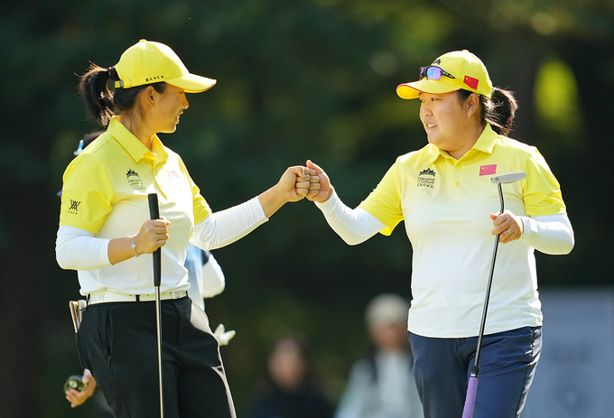 중국팀 인 러닝(오른쪽)과 루이신 리우가 3번 홀 버디 성공 후 주먹을 맞대로 기뻐하고 있다