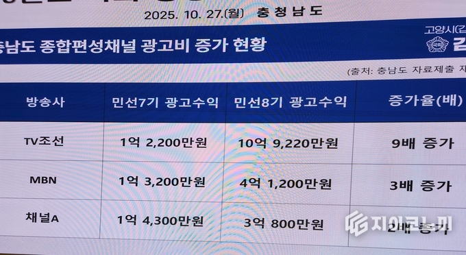 의원실이 공개한 자료에 따르면, TV조선 광고비는 민선 7기 1억 2천만 원에서 김태흠 지사 취임 후 10억 9천2백만 원으로 약 9배 급증, MBN은 1억 원에서 4억 원으로, 채널A는 1억 4천만 원에서 3억 8천만 원으로 각각 2~3배 증가한 것으로 나타났다.