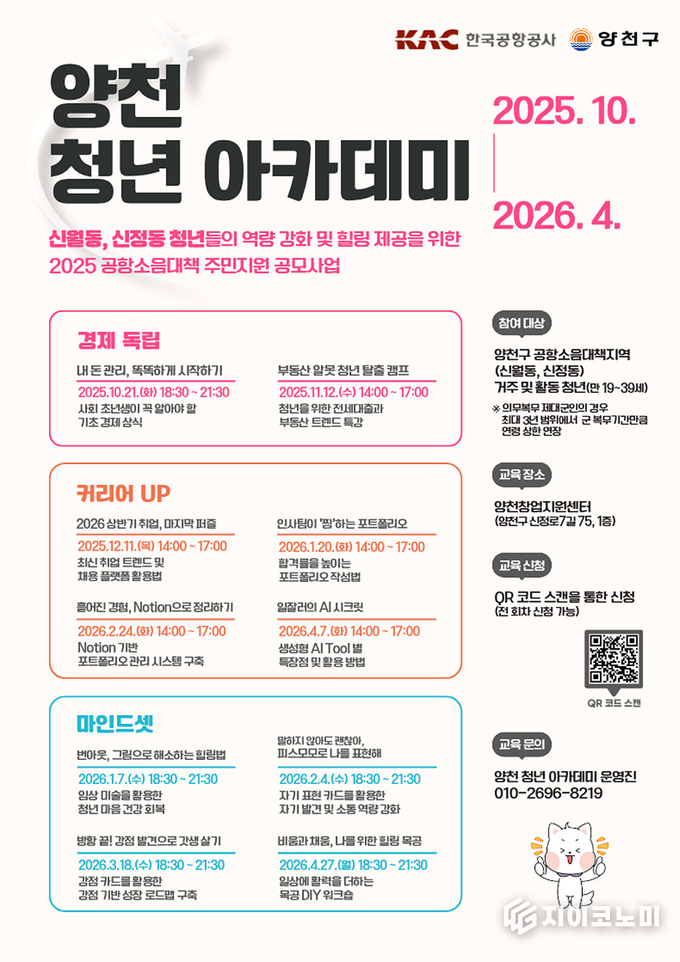 지이코노미 최영규 기자 | 양천구(구청장 이기재)는 지역 청년들의 진로 설계와 역량 강화를 지원하기 위해 ‘양천 청년 아카데미’를 운영한다고 5일 밝혔다.