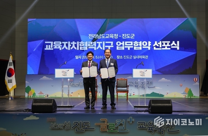 두 기관은 지난 5일 진도실내체육관에서 열린 ‘2025 보배섬 진도 글로컬 교육축전’ 자리에서 ‘전라남도 교육자치협력지구 운영 업무협약’을 체결하며 교육 협력의 새 출발을 알렸다.