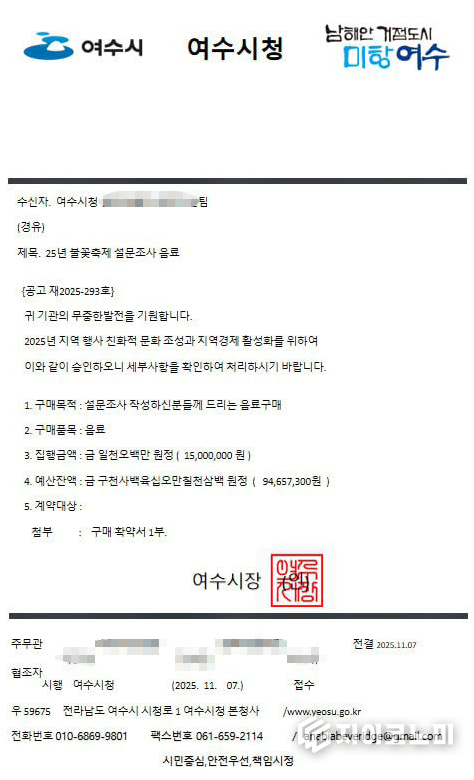 지난 7일에는 ‘2025년 불꽃축제 설문조사 음료’ 명목의 위조 공문까지 등장해 시선을 끌었다. 공문 형식을 흉내 낸 정교한 문서였다는 점에서, 단순 장난이 아닌 계획적인 범죄라는 우려가 커졌다.