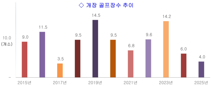 또한 골프의 초과 수요를 해소시키기 위해서는 골프장 공급이 크게 확대되어야 하는데, 신규 개장 골프장수가 올해 4개소에 불과했다. 현재 공사중·추진중인 골프장수가 100여곳에 달하고 있음에도 불구하고, 골프장 건설 관련 규제가 강화되면서 개장 일정이 지연되고 있기 때문이다.