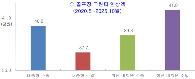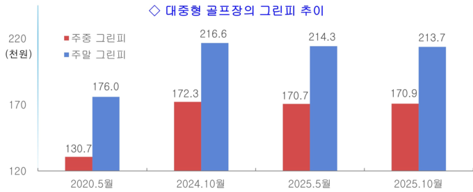 한편 대중형 골프장의 기준 그린피(2025년 기준)는 주중 19만 7,000원, 주말 25만 8,000원이다. 그런데 이 기준을 초과하는 대중형 골프장이 주중 58개소로 18홀 이상 전체 대중형 골프장수 257개소의 22.6%에 달하고 있다.