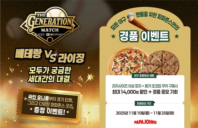 경품으로는 ▲더 제너레이션 매치 상상인 메디카코리아 티켓(1인 2매 100명)을 비롯해 ▲참가 선수 싸인 유니폼 ▲파파존스 라지사이즈 피자 무료 시식권 ▲브라운 브레스 콜라보 모자, 양말, 에코백 ▲페스티버 콜라보 카드 지갑 ▲수퍼 파파스 담요 등이 준비돼 있다. 당첨자에게는 개별 연락을 통해 안내될 예정이며, 야구 프로모션의 자세한 내용은 파파존스 온라인 채널에서 확인할 수 있다.
