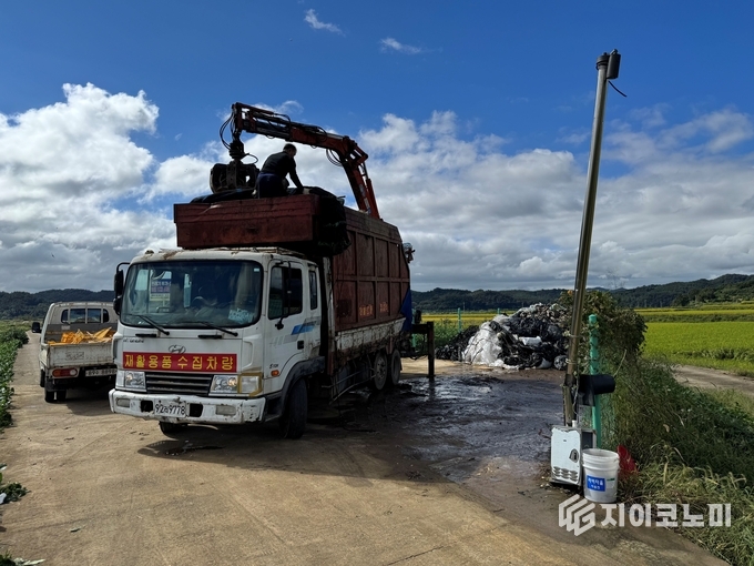 농민들이 마을 공동집하장에 영농폐기물을 모아두면, 한국환경공단의 순회 수거 차량이 이를 운반해 전문 재활용업체로 넘긴다. 버려진 자원이 다시 자원으로 돌아가는 순환 구조다.