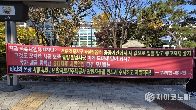이 관계자에 따르면, 현재 시흥 하중지구 현장(하중동 성원아파트 맞은편)에 설치된 가설 방음벽은 중고 자재이며, 심각한 안전 문제를 안고 있다고 지적했다.