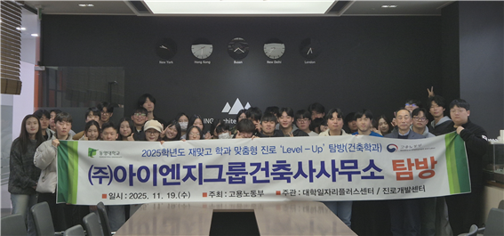 ‘2025학년도 학과 맞춤형 진로 Level-Up 프로그램’의 일환으로 진행된 이번 프로그램은 건축사무소 조직 구조 및 직무 이해와 설계·감리 등 건축 프로젝트 진행 과정 이해, 사무 환경 및 시설 견학, 현직 건축 전문가 및 건축사와의 멘토링으로 구성됐다.