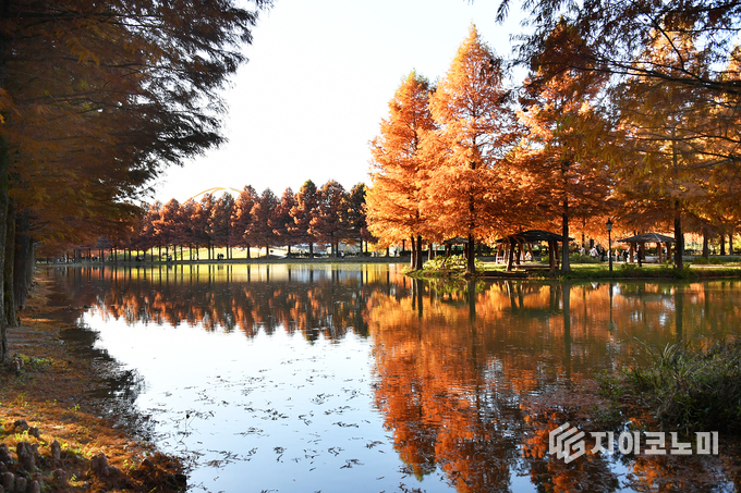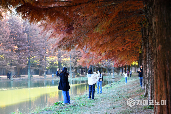 ▲잔잔한 물결에 단풍빛이 스며들며 호수가 계절의 색을 품은 듯 고요함을 머금는다. 그 풍경에 이끌린 이들이 발걸음을 멈춰 감성을 채우는 모습은 담양 메타세쿼이아길의 늦가을 분위기를 한층 더 깊게 만든다.