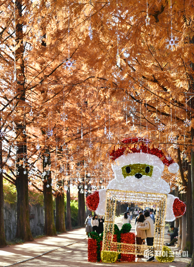 ▲루돌프와 산타 포토존 앞에서 늦가을 풍경을 배경 삼아 추억을 남기는 연인들의 밝은 미소가 담양 메타세쿼이아길을 더욱 따뜻하게 물들이는 장면. 담양군 제공