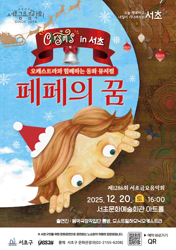 지이코노미 양하영 기자 | 서울 서초구(구청장 전성수)는 오는 20일 오후 4시, 서초문화예술회관 아트홀에서 2025년 송년음악회 「크리스마스 in 서초-페페의 꿈」를 개최한다고 밝혔다.
