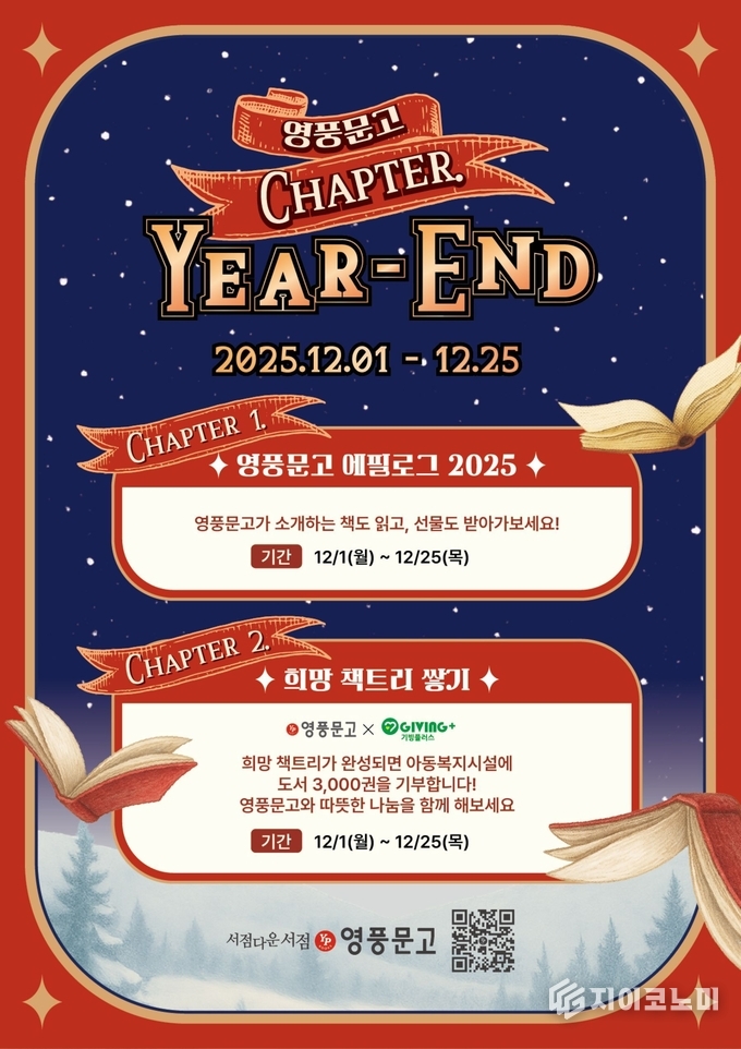 영풍문고가 12월 1일부터 25일까지 ‘영풍문고 2025 Chapter Year-End’를 진행하며 연말 독서 문화를 확산하기 위한 다양한 프로그램을 선보였다. 단순한 연말 이벤트를 넘어 사회적 기여 활동을 결합한 점이 눈길을 끈다.
