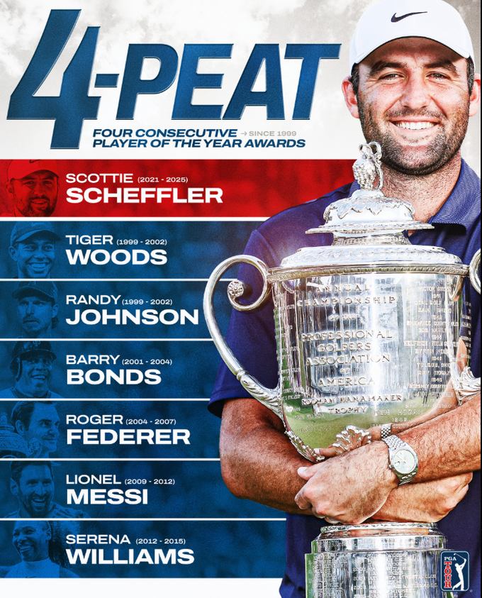 지이코노미 김대진 기자 | PGA 투어 '올해의 선수상' . 그 주인공은 세계 랭킹 1위 스코티 세플러(미국)다. 올해로 4년 연속 수상이다.