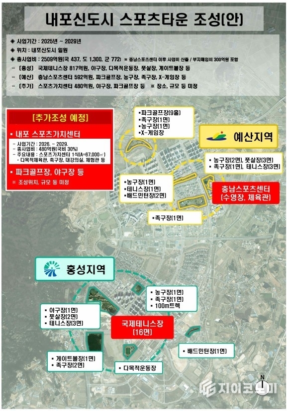 내포 스포츠타운은 총면적 27만6714㎡ 규모로, 사업비 2509억 원을 투입해 조성된다. 공간은 충남국제테니스장을 중심으로 한 홍성 지역과 충남스포츠센터를 중심으로 한 예산 지역으로 나눠 단계적으로 개발된다.