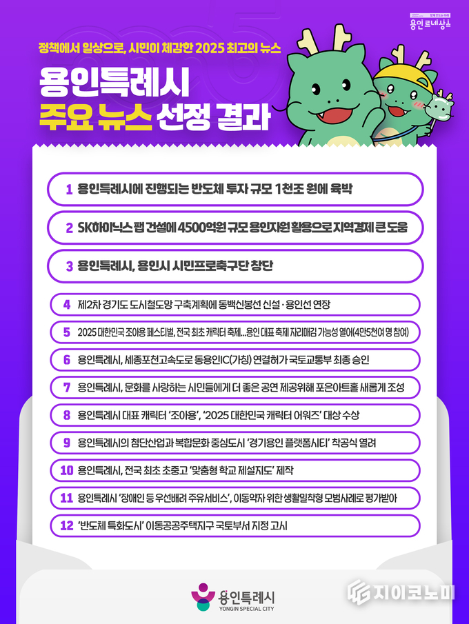 지이코노미 최영규 기자 | 2025년 용인특례시(시장 이상일)를 빛낸 최고의 뉴스로 '반도체 투자규모 1000조 원에 육박'이 뽑혔다.