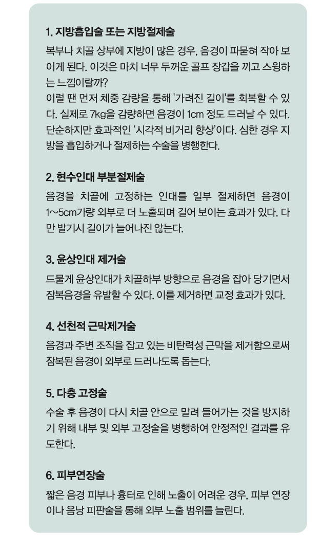 이러한 수술들은 단독으로 시행되기보다는 환자의 원인과 상태에 따라 복합적으로 시행되어야 하며, 반드시 숙련된 비뇨기과 전문의에 의해 진행되어야 한다. 결국, 길이연장술도 골프와 마찬가지다.