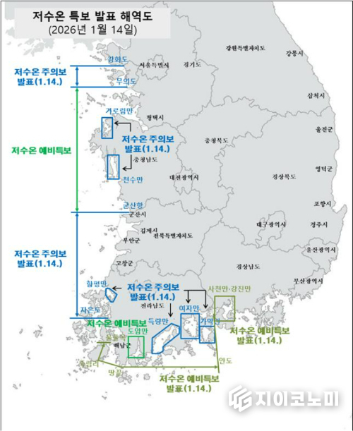 전라남도는 14일 오전 10시를 기해 서부 해역과 내만 주요 해역에 저수온 주의보가 내려지자, 양식어류 피해를 막기 위한 현장 대응에 속도를 높였다.