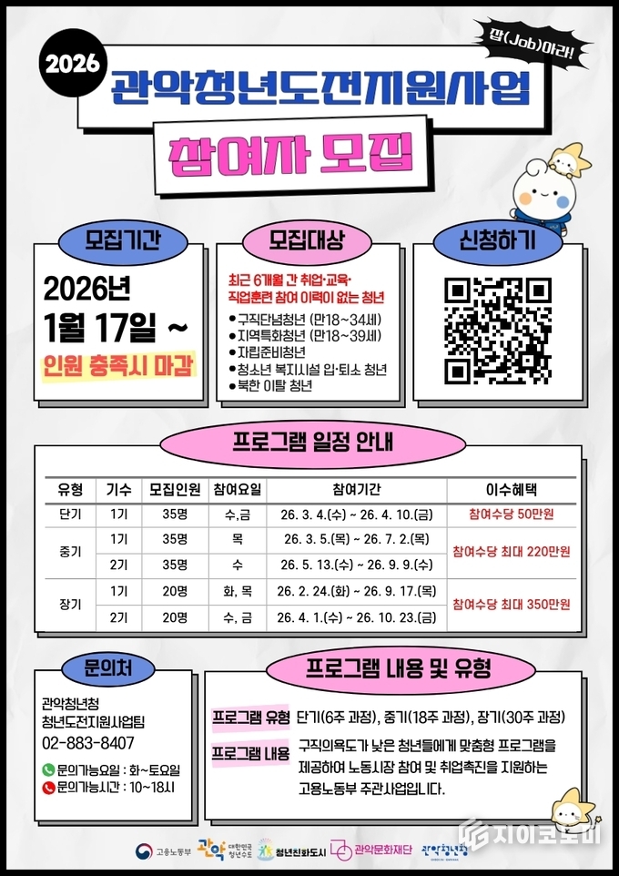 지이코노미 최영규 기자 | 관악구(구청장 박준희)가 구직을 단념한 청년들의 사회 진입을 돕기 위해 오는 1월 17일부터 ‘2026년 청년도전지원사업’ 참여자를 모집한다.