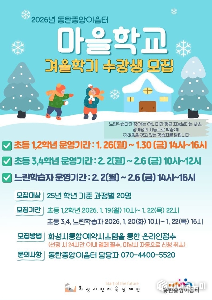 지이코노미 최영규 기자 | 화성시인재육성재단(대표이사 임선일) 동탄중앙이음터는 1월 26일부터 2월 6일까지 진행하는 ‘2026년 동탄중앙이음터 마을학교 겨울학기’ 프로그램에 참여할 초등학생을 모집한다.
