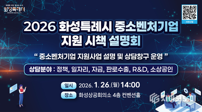 지이코노미 최영규 기자 | 화성특례시(시장 정명근)가 관내 중소기업과 소상공인의 경영 애로 해소와 지원사업 활용도를 높이기 위해 오는 26일 화성상공회의소 컨벤션홀에서 ‘2026년 화성특례시 중소벤처기업 지원 시책 설명회’를 개최한다.