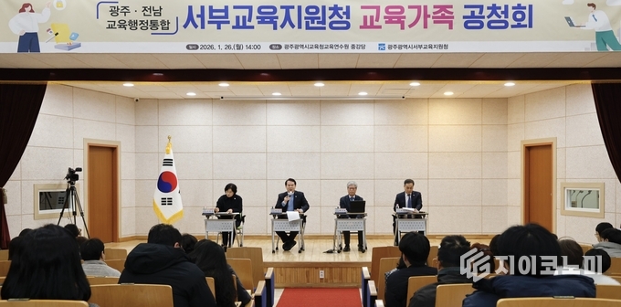 지이코노미 한정완 기자 | 광주광역시교육청(교육감 이정선)은 26일 광주시교육청교육연수원 중강당에서 서부권 교직원, 학부모, 시민 등을 대상으로 ‘광주·전남 교육행정통합’ 추진 현황 공유 및 의견 청취를 위한 공청회를 개최했다.
