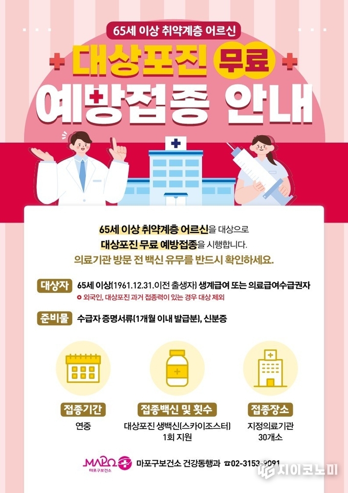 지이코노미 최영규 기자 | 마포구(구청장 박강수)는 지역 내 65세 이상 생계‧의료수급자 어르신을 대상으로 대상포진 무료 예방접종을 연중 시행한다.