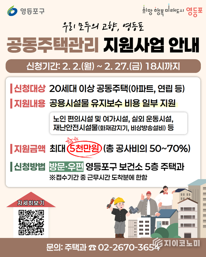 지이코노미 최영규 기자 | 영등포구(구청장 최호권)가 공동주택 주민의 쾌적하고 안전한 생활여건 조성을 위해 ‘2026년 공동주택관리 지원사업’을 추진한다고 밝혔다.