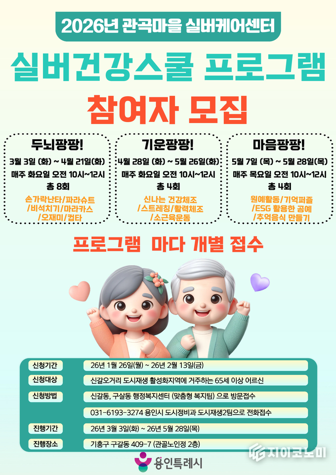 지이코노미 최영규 기자 | 용인특례시(시장 이상일)는 ‘관곡마을 실버케어센터 실버건강 프로그램’ 참가자를 13일까지 모집한다.