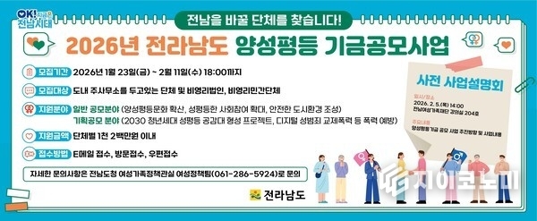 참여 대상은 전남에 주사무소를 둔 단체와 비영리법인, 비영리민간단체다. 양성평등 촉진, 여성 인권 보호, 복지 증진 활동 경험이 있다면 지원할 수 있다. 서류 심사 이후 전남도양성평등위원회 심의를 거쳐 최종 대상이 결정된다.