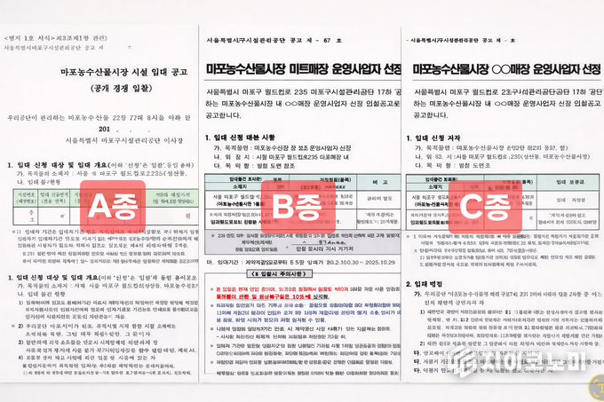 공단에는 마트매장 신규 운영자 선정을 위한 표준 공고문(A종)이 존재한다. 공정성과 일관성을 확보하기 위한 장치다. 그런데 문서는 해당 입찰에서 규정 개정이나 내부 의결 없이 임의 작성된 공고문(B종)이 사용됐다고 적고 있다.