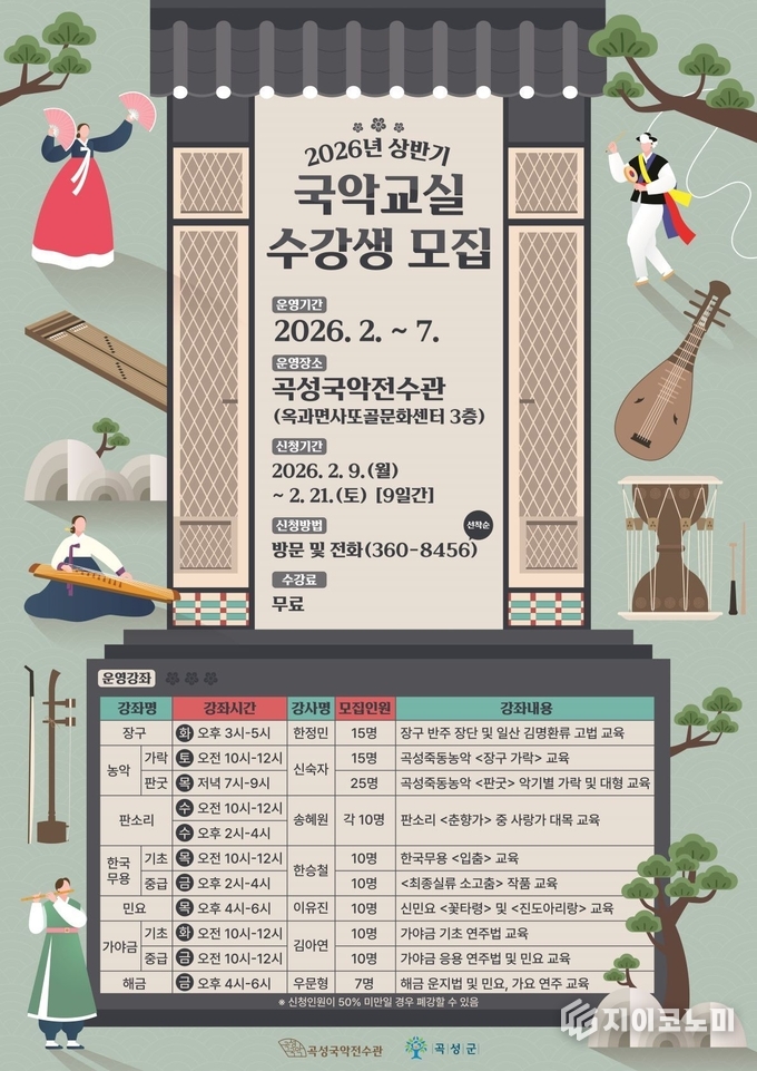 전통문화 계승과 군민 문화 향유 기회 확대에도 힘을 쏟고 있다. 군은 곡성국악전수관에서 운영하는 ‘2026년 상반기 국악교실’ 수강생을 오는 9일부터 21일까지 모집한다.