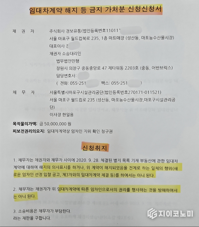 지이코노미가 추가 확인한 문서는 경보유통이 제출한 임대차계약 해지 금지 가처분 신청서다. 핵심은 단순하다. 공단이 계약 해지, 신규 임차인 선정, 제3자 임대차 체결을 하지 못하도록 막아 달라는 요구다. 가처분은 대개 시간이 필요한 쪽이 선택하는 법적 장치다.