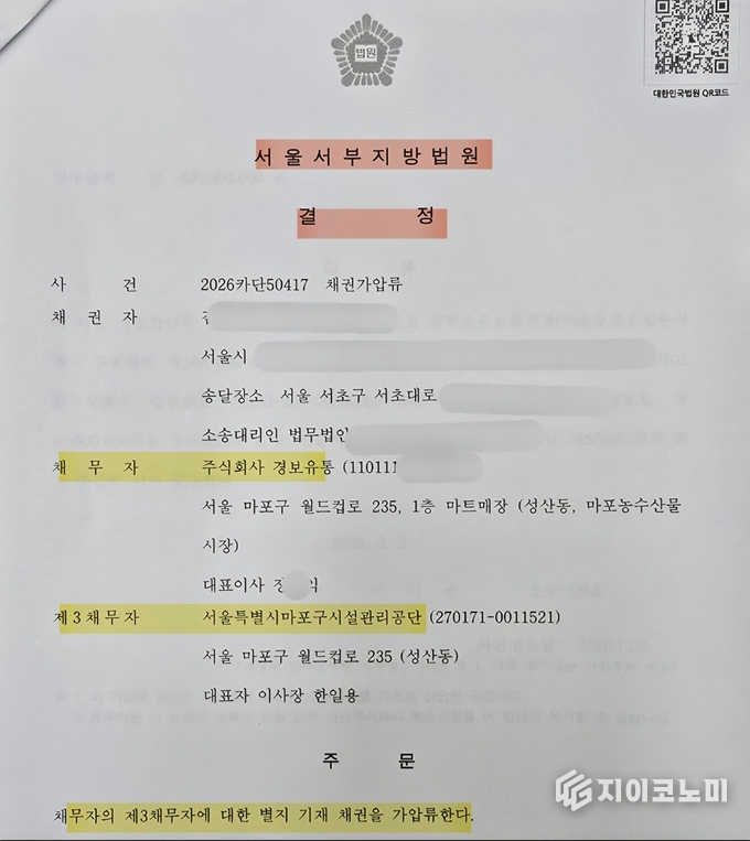 서울서부지방법원은 올해 2월 3일, 채권자 김 모 씨가 신청한 채권가압류를 인용했다. 결정문에 따르면 채권자는 경보유통을 상대로 ‘약속이행담보금 반환 청구권’을 주장했고, 청구금액은 4억 원이다. 가압류 대상은 경보유통이 마포시설관리공단에 대해 갖는 채권이다.